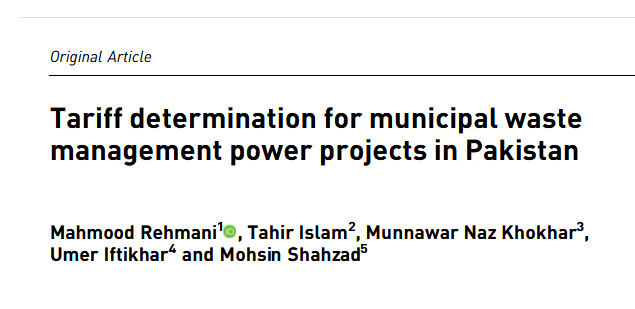 Tariff determination for municipal waste management power projects in Pakistan.
